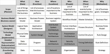The model has six basic questions (columns) which must be answered by each of six viewpoints (rows) in order to describe an architecture. The basic questions are: What, How, Where, Who, When, and Why, and the viewpoints are: